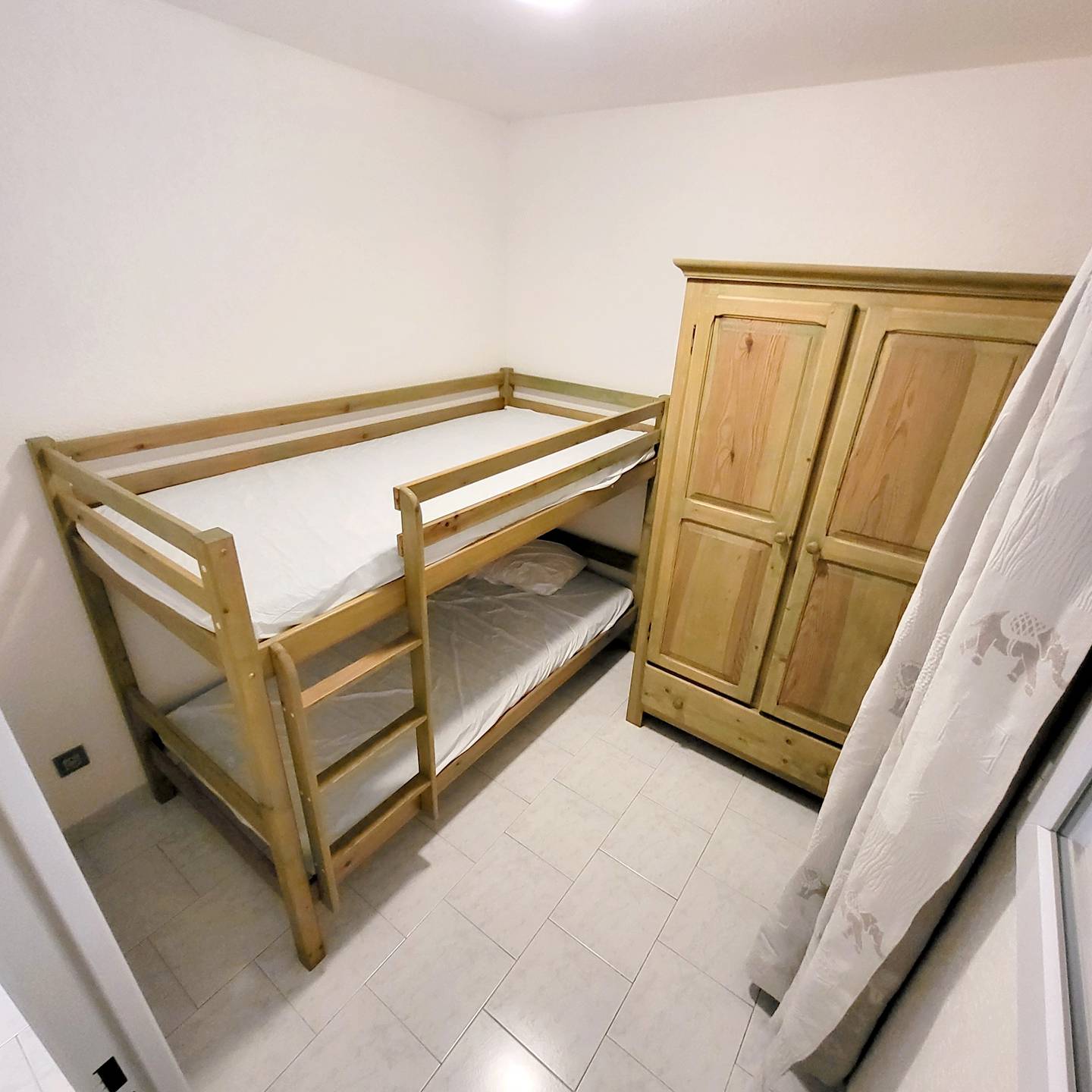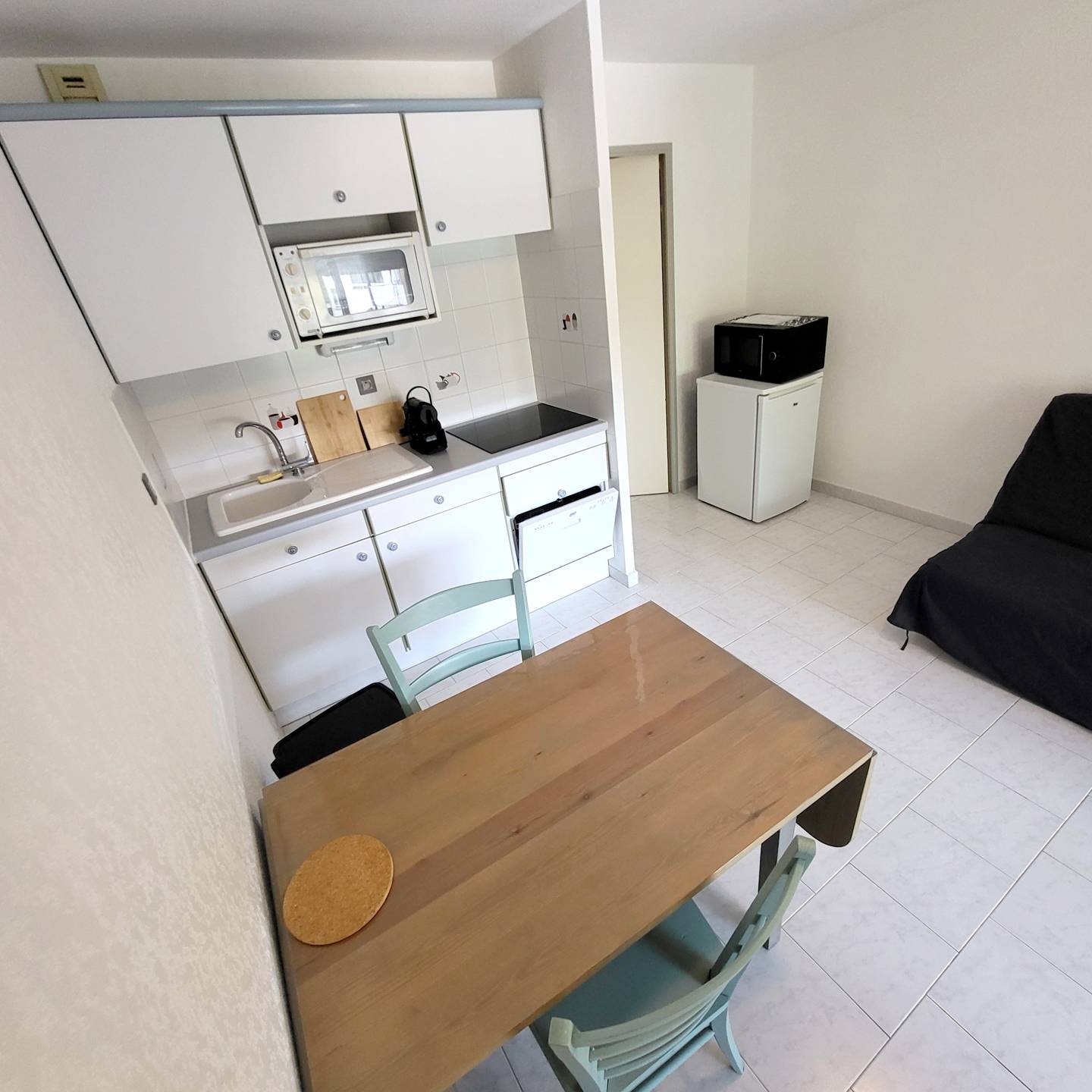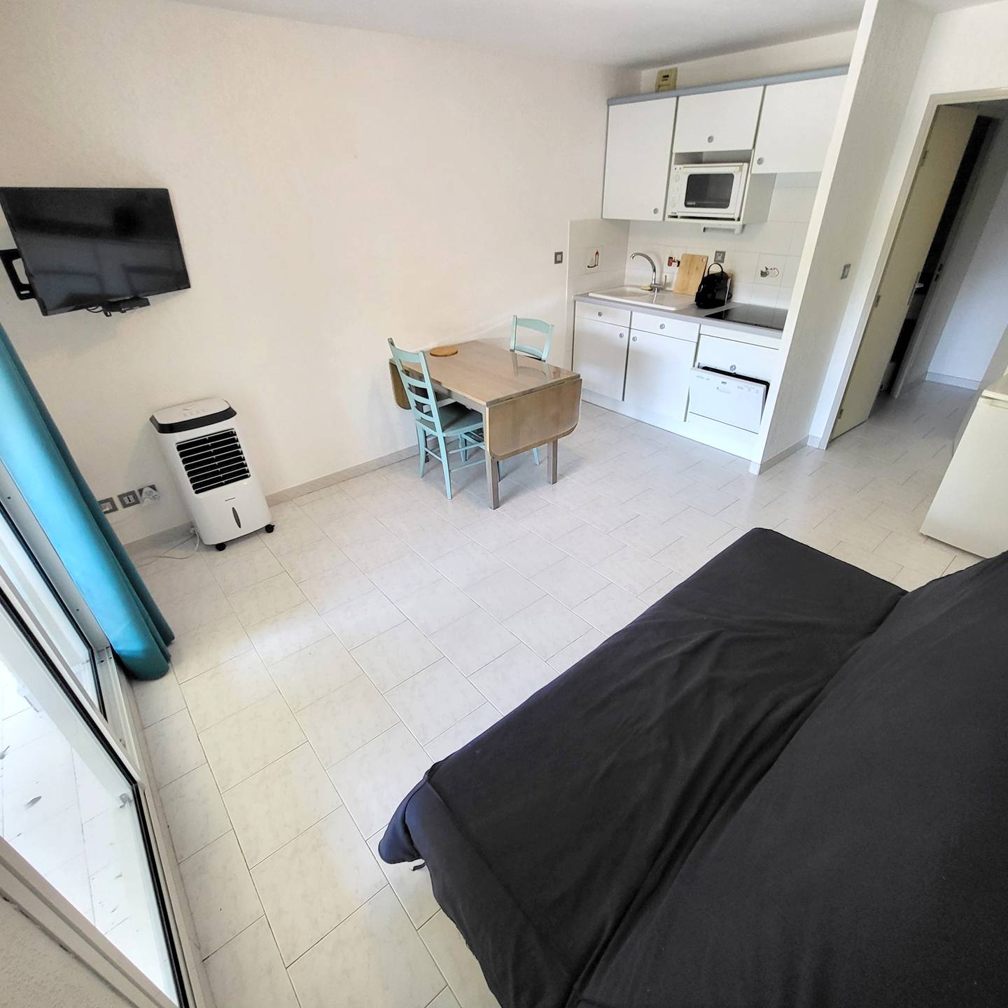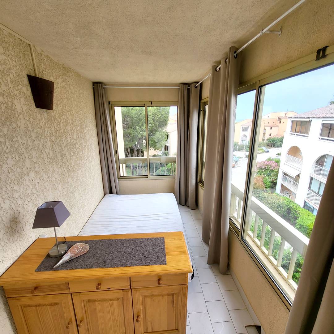 Loggia (7 m²) avec table et chaises de jardin et volet roulant manuel - Véranda (7 m²) aménagée en coin nuit avec baies vitrées amovibles, rideaux occultants spécial nuit, 1 lit 2 places (en 140 x 190), 1 ventilateur et commode - Entrée avec placards / penderie, aspirateur balai, table et fer à repasser - Cuisine ouverte (plaque de cuisson vitrocéramique 4 feux, réfrigérateur top avec freezer, micro-ondes, four, lave-vaisselle 6 couverts, cafetière à dosettes café/thé Nespresso, grille-pain) - Pièce principale avec 1 canapé clic-clac convertible 2 places (en 140 x 190), coin repas, téléviseur mural avec décodeur TNT et 1 rafraîchisseur d'air mobile - 1 chambre avec 2 lits superposés 1 place (en 90 x 190) et armoire - Salle de bains avec vasque, baignoire, pare douche, plaques de lissage cheveux et sèche-serviettes – 1 WC indépendant.