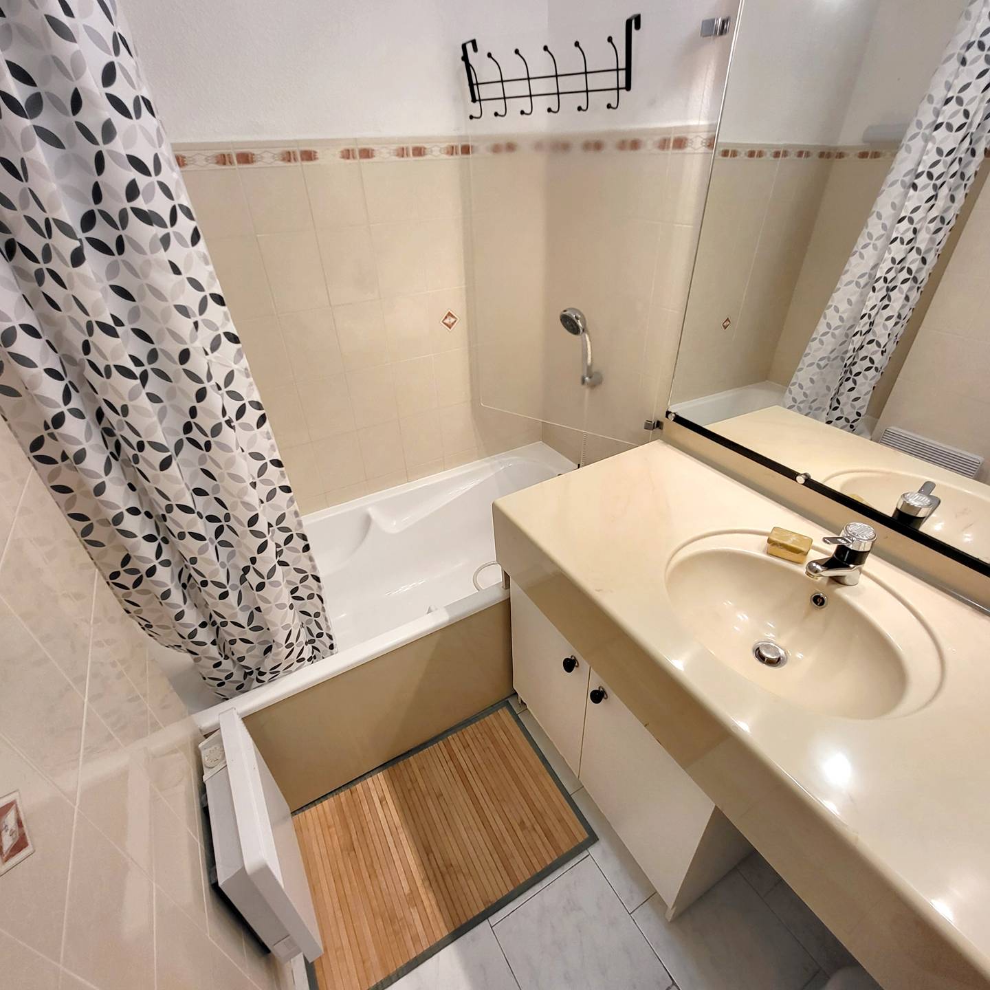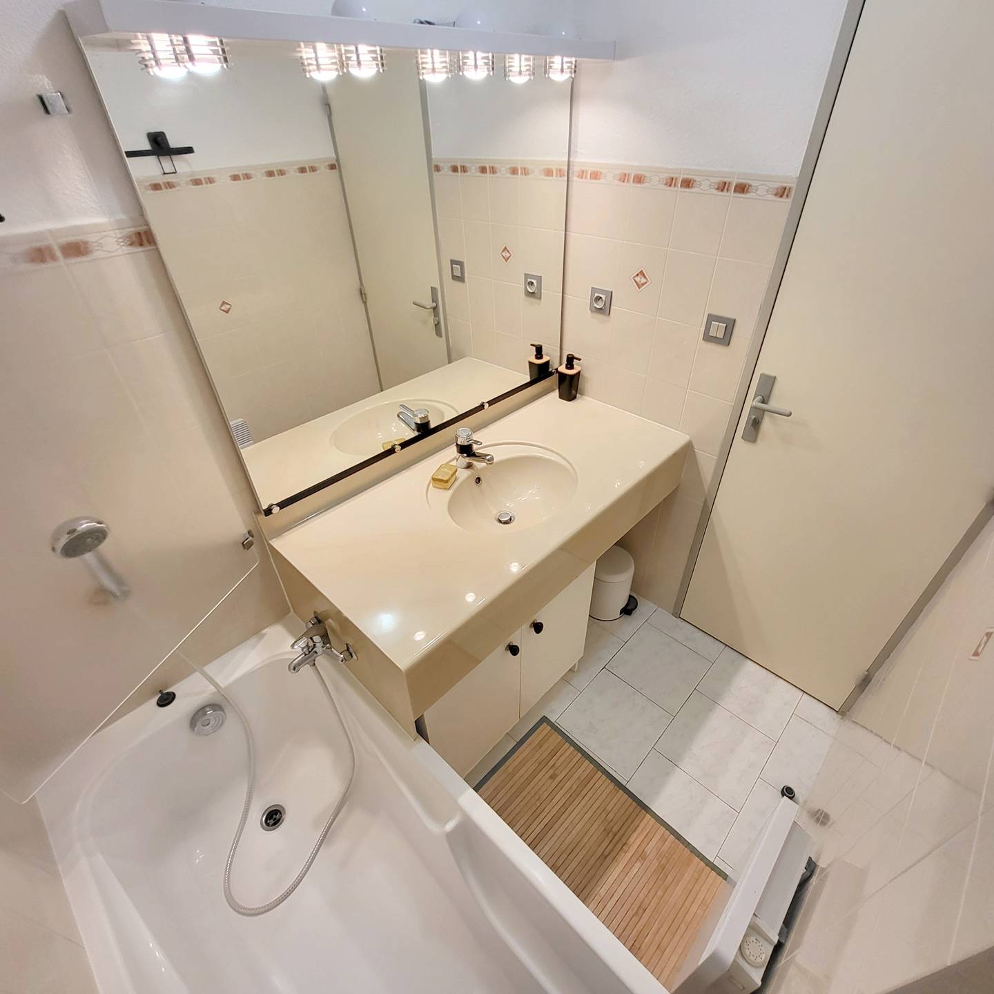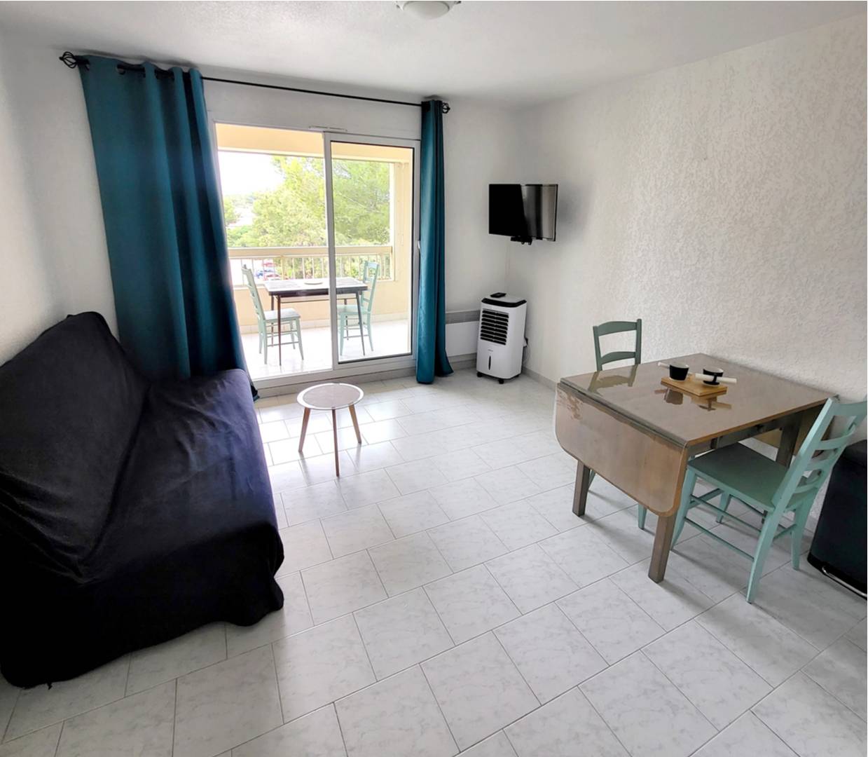 Loggia (7 m²) avec table et chaises de jardin et volet roulant manuel - Véranda (7 m²) aménagée en coin nuit avec baies vitrées amovibles, rideaux occultants spécial nuit, 1 lit 2 places (en 140 x 190), 1 ventilateur et commode - Entrée avec placards / penderie, aspirateur balai, table et fer à repasser - Cuisine ouverte (plaque de cuisson vitrocéramique 4 feux, réfrigérateur top avec freezer, micro-ondes, four, lave-vaisselle 6 couverts, cafetière à dosettes café/thé Nespresso, grille-pain) - Pièce principale avec 1 canapé clic-clac convertible 2 places (en 140 x 190), coin repas, téléviseur mural avec décodeur TNT et 1 rafraîchisseur d'air mobile - 1 chambre avec 2 lits superposés 1 place (en 90 x 190) et armoire - Salle de bains avec vasque, baignoire, pare douche, plaques de lissage cheveux et sèche-serviettes – 1 WC indépendant.