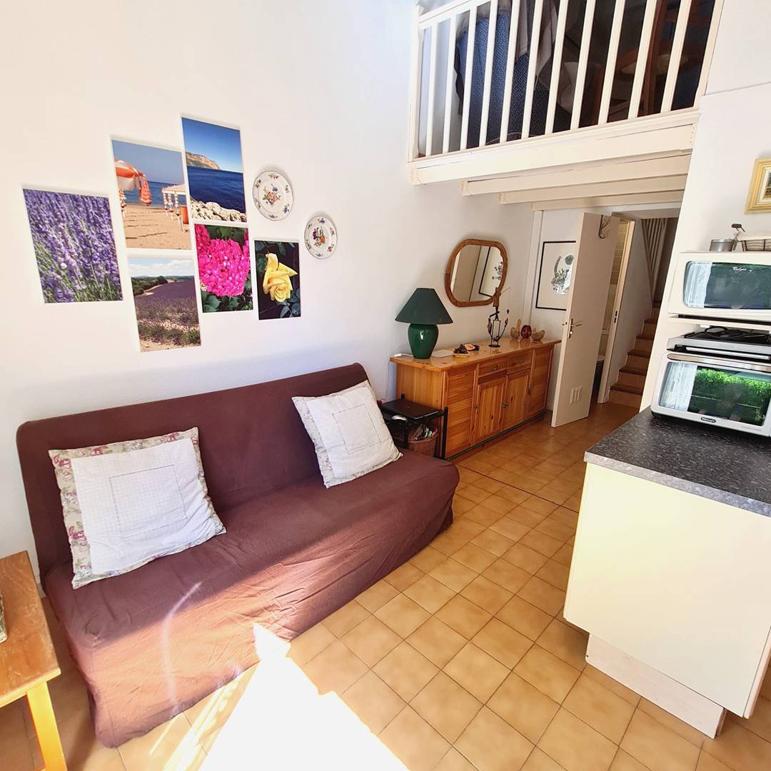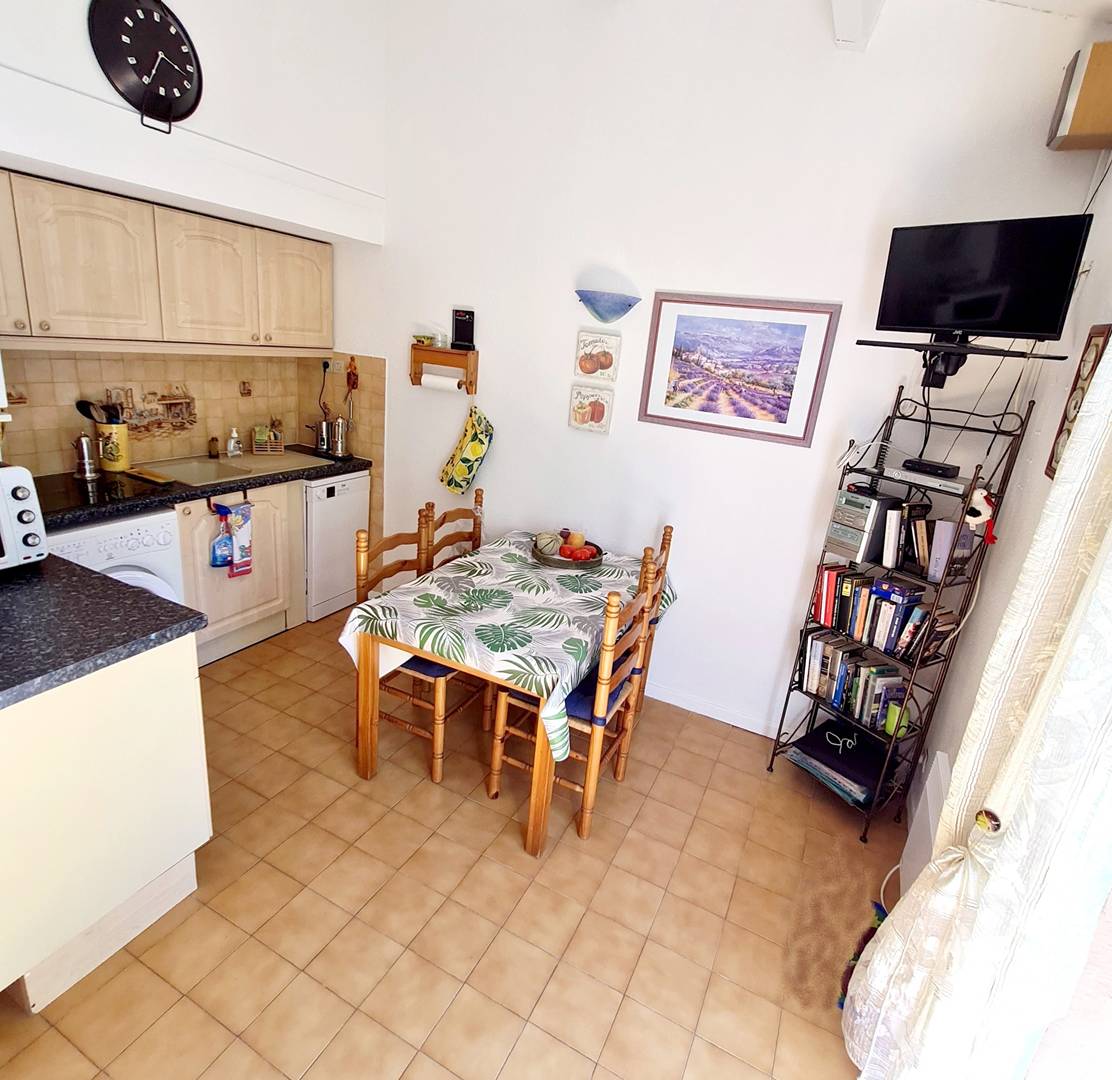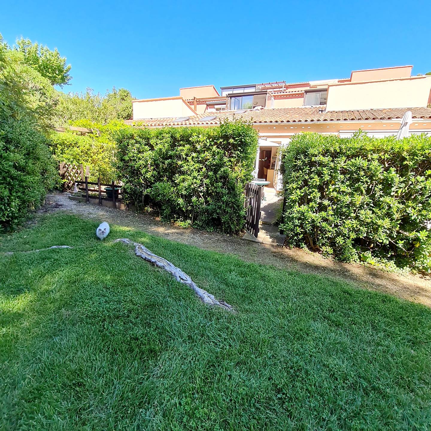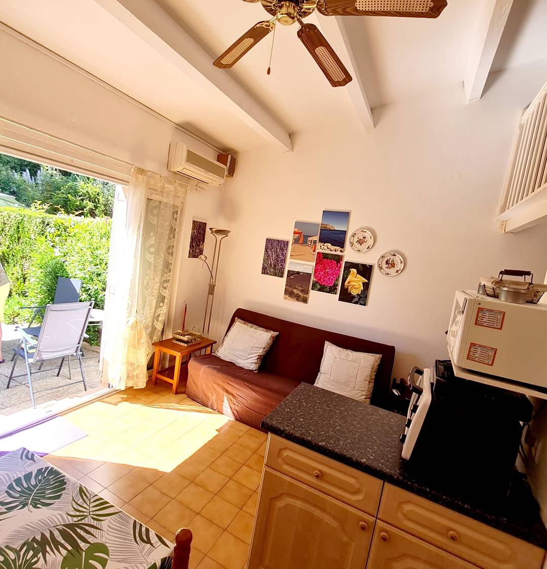 Jardin clôturé avec tables et chaises de jardin, 2 chaises longues, parasol, plancha électrique et point d'eau - Accès direct au parc très verdoyant et au lac du domaine - Cuisine ouverte sur le séjour (réfrigérateur / congélateur - four - micro-ondes - plaque de cuisson vitrocéramique 4 feux - lave-vaisselle - lave-linge - 2 cafetières italiennes - aspirateur - fer à repasser) - Pièce principale avec 1 canapé convertible 2 places (en 140 x 190), téléviseur mural et plafonnier ventilateur - 1 chambre (non climatisée) avec 2 lits 1 place (en 90 x 190) et armoire - Salle d'eau avec douche et 1 WC intégré - 1 WC avec lave-mains.