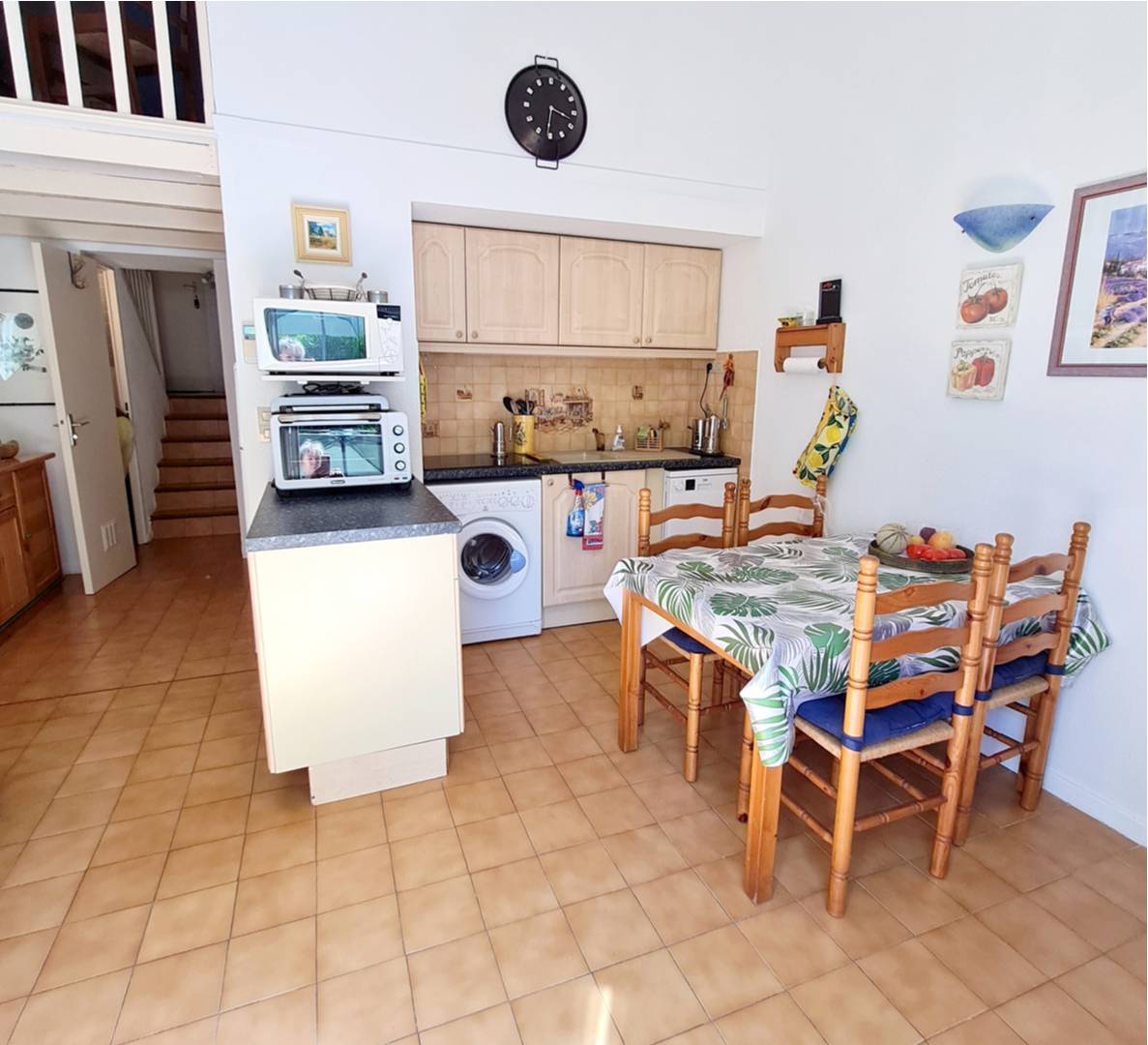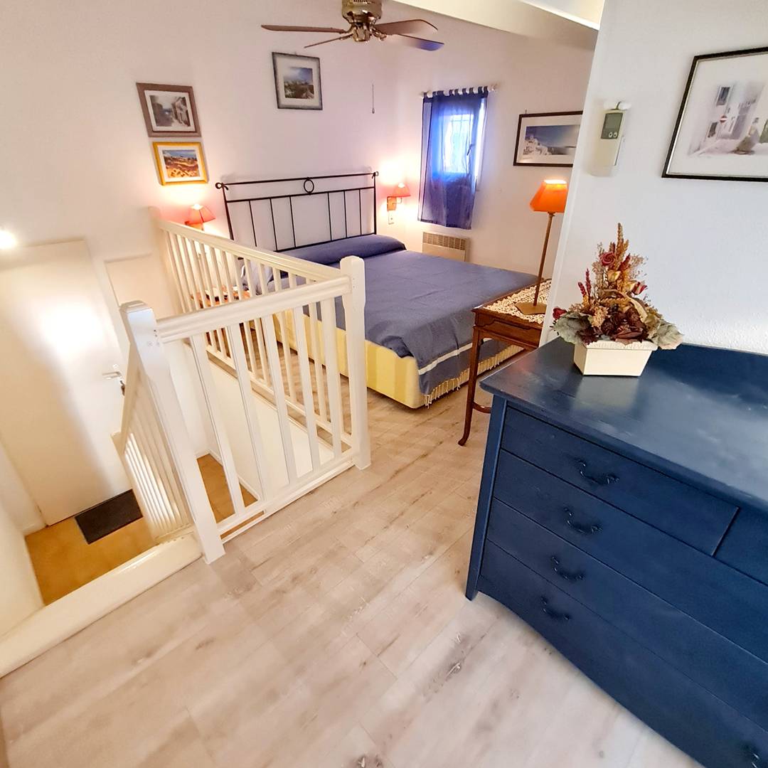 A l'étage (mezzanine) : Espace détende avec commode et fauteuil - 1 chambre avec 1 lit de 2 places (en 190 x 200) et plafonnier ventilateur.
